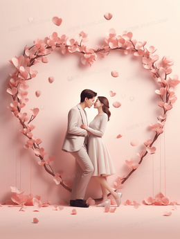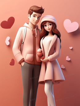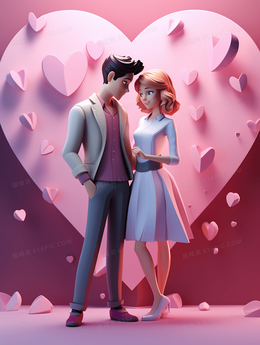 粉色七夕情人节3D立体情侣插画