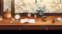 书房书桌上摆放的打开的书本与音乐播放器插画