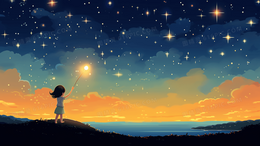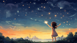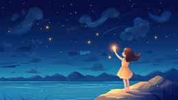 梦幻背景星空中月光下一个在湖水边的小女孩插画