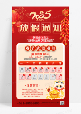 红色喜庆2025蛇年新年春节放假通知手机海报