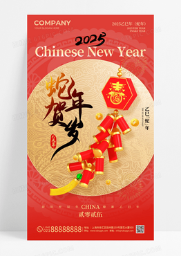 红色烫金鞭炮元素2025蛇年新年手机宣传海报