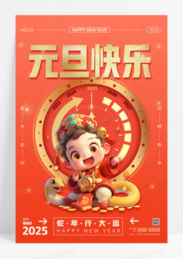 红色简约元旦2025蛇年新年春节时钟海报