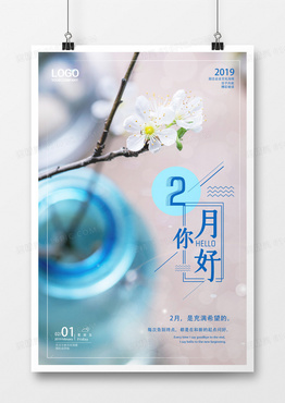 蓝色小清新2月你好海报