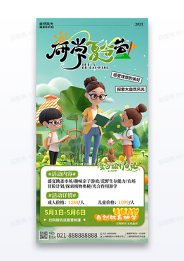 绿色简约3D草地夏日暑期研学之旅露营搭帐篷宣传海报