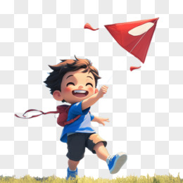 3D卡通穿蓝色短袖的小男孩在草地放风筝免抠元素
