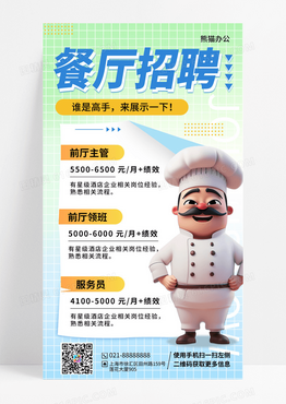 蓝色渐变简约3D厨师美食招聘手机文案海报