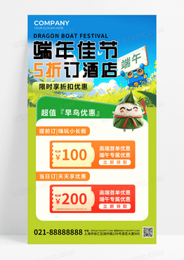 蓝绿色3D创意排版风格端午佳节旅游酒店促销活动手机文案海报端午节端午