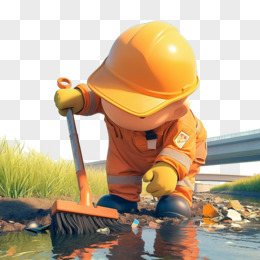 3D卡通环卫工人在清理河里的垃圾免抠元素