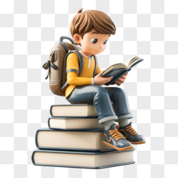 3D立体风格坐在书山看书的可爱男孩免抠元素