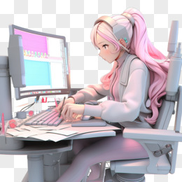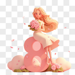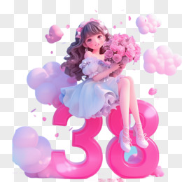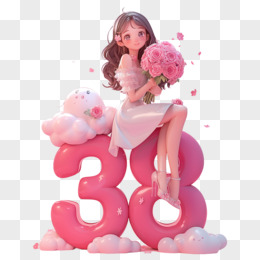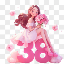 3D卡通抱着鲜花的女性坐在38数字上免抠元素