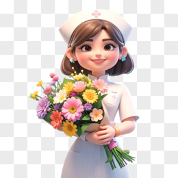 3D卡通抱着鲜花的女医生抱着鲜花站在花丛中免抠元素