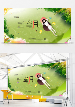 创意扁平插画风三月你好月份问候展板设计