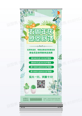 绿色简约清新风5周年庆感恩回馈新老客户来店消费易拉宝3周年店庆海报