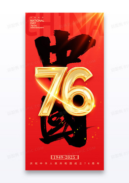 红色金字国庆节中国毛笔字国庆节76周年海报