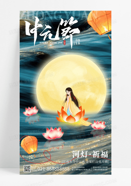 绿色鎏金风河灯祈福中元节手机宣传海报