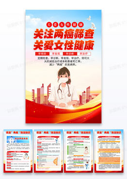 红色卡通关注两癌筛查关注女性健康套图乳腺癌防治月预防乳腺癌