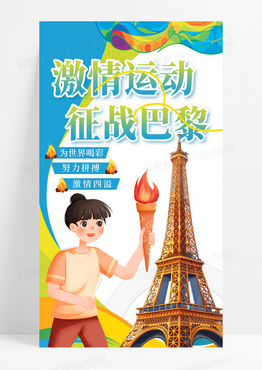 蓝色插画2024巴黎运动会火炬手机宣传海报