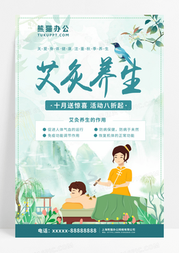 卡通艾炙蓝色国潮卡通艾炙养生秋季养生宣传海报