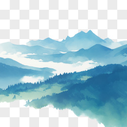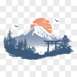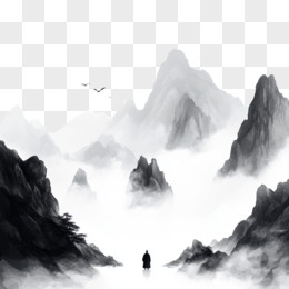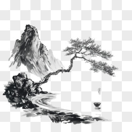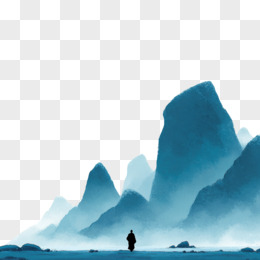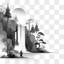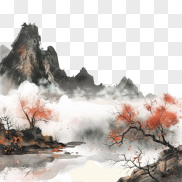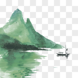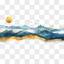 鎏金风格山水画山脉湖泊和小船免抠元素
