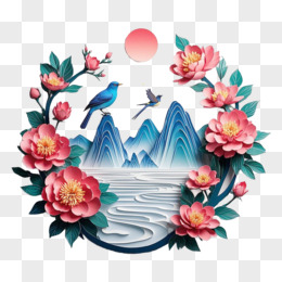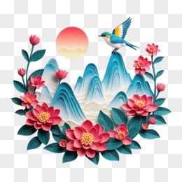 3D剪纸风山水花鸟免抠元素