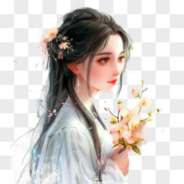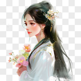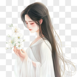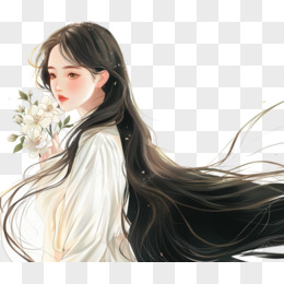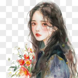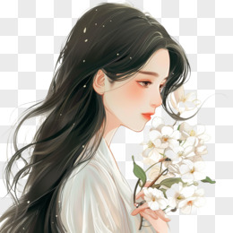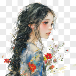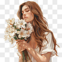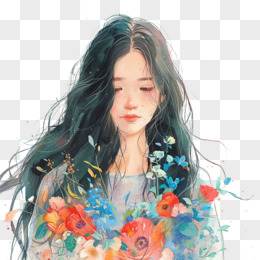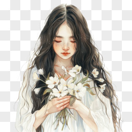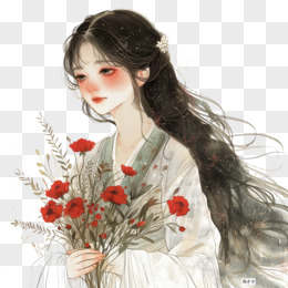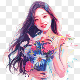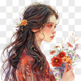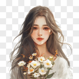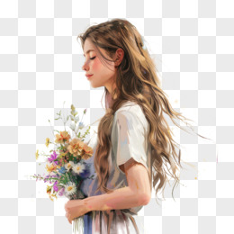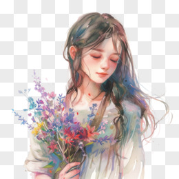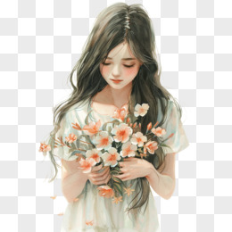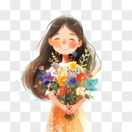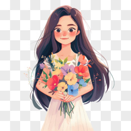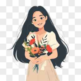 插画风女孩手捧鲜花免抠素材