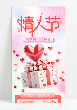 粉色弥散风C4D爱心礼物情人节美妆特惠优惠活动手机海报