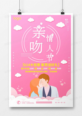 粉色情侣亲吻白云花爱心舞动唯美风亲吻情人节海报