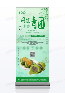 绿色清新山水画网红艾叶青团美食易拉宝X展架