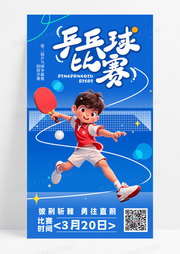 蓝色简约插画乒乓球运动比赛活动手机宣传海报