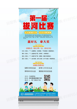 蓝色可爱卡通简约第一届拔河比赛拔河比赛展架易拉宝