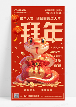 春节拿着红色卷轴拜年的卡通蛇IP形象免抠元素