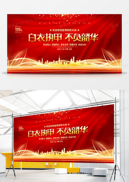 红色大气白衣执甲不负韶华2020抗疫表彰大会背景展板设计