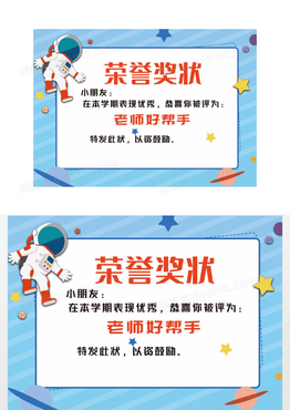 蓝色卡通宇宙宇航员奖状幼儿园老师好帮手荣誉奖状