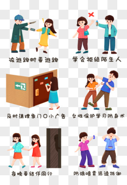 一组手绘卡通女性自我保护套图之学会拒绝陌生人素材