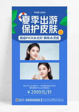 蓝色简约美容美肤夏季出游保护皮肤医美AI摄影图手机海报