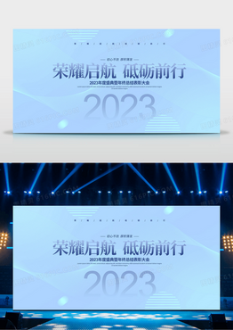 蓝灰简约2023荣耀启航砥砺前行年会背景展板设计2023年会
