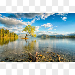 唯美蓝天白云绿树映在水面海报背景