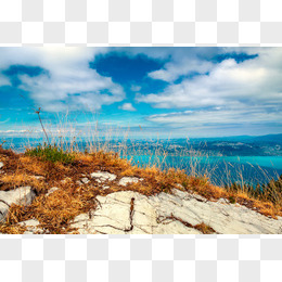蓝天白云水面荒山小草海报背景