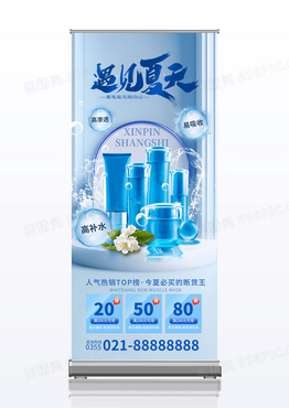 蓝色清新清凉遇见夏天化妆品宣传促销展架海报