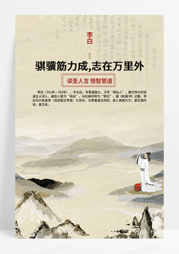 复古纸质背景手绘李白学校教育名人名言海报学校教育名人名言海报展板