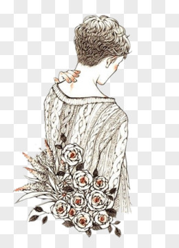 手绘背影拿花的女生插画元素