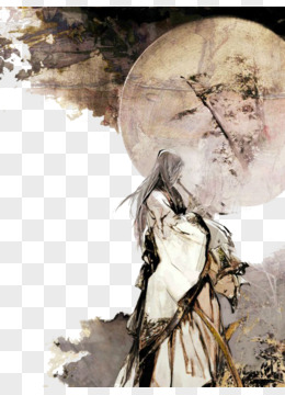 手绘卡通水墨风格旗袍美女半身背影油纸伞民国素材