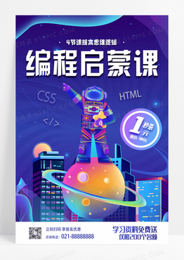紫色卡通编程启蒙课1元秒杀编程海报设计
