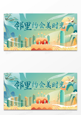 绿色背景创意扁平化风格邻里约会美时光地产业主生日展板设计