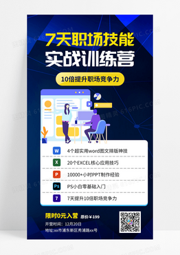 深蓝色扁平化职场技能技能实战训练营手机海报技能培训手机海报