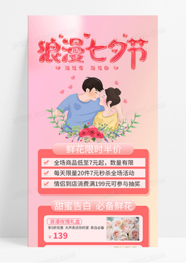 粉色卡通插画扁平浪漫七夕节甜蜜邂逅鲜花促销活动鲜花长图海报宣传
