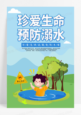 蓝色简约卡通珍爱生命预防溺水宣传海报