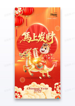 红金马年喜庆2026马上发财海报