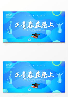 蓝色流体渐变正青春在路上2022毕业晚会典礼展板设计毕业典礼
