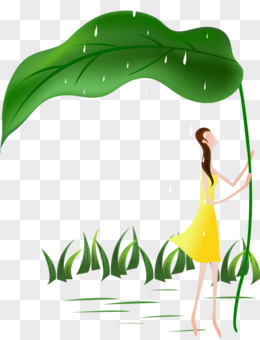 卡通手绘撑着叶子避雨的人免抠元素